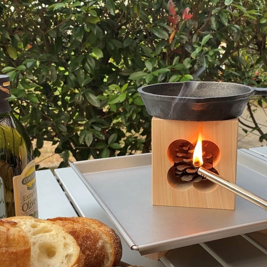 松ぼっくりに火をつけると、上部に貫通した穴に向け炎が上がり、そこにスキレットを置くと簡単な調理ができます。十文字の切り込みは五徳の役割となります。(松ぼっくりは天然の着火剤と言われています)