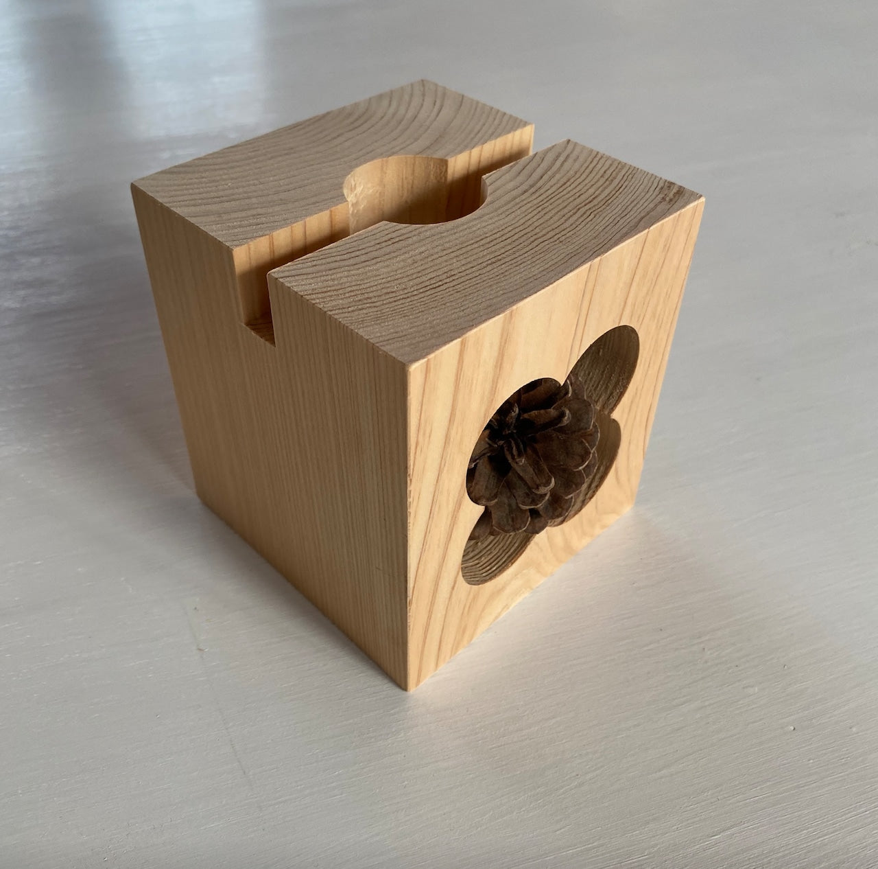 正面のクローバーをあしらった窓からは松ぼっくりが顔を出し、すっきりとした姿でありながら愛らしく、ヒノキの香りと共にお部屋に癒しをもたらします。