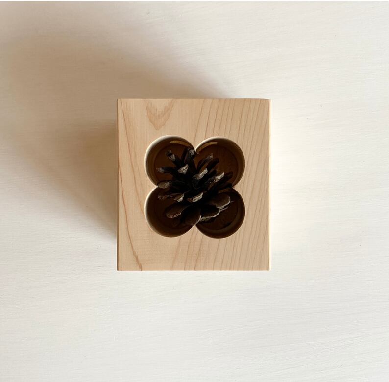 松ぼっくりも高知県産。クローバーをあしらった窓にピタリとはまる大きさのものを選び、きれいに洗って乾かしてから一つ一つ手作業で入れております。