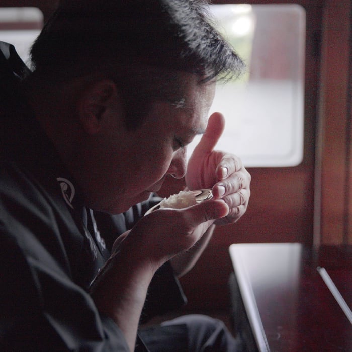 米ザルからボウルに戻り、水を切った状態で、お米を優しく揉むように置いて離すを繰り返します。